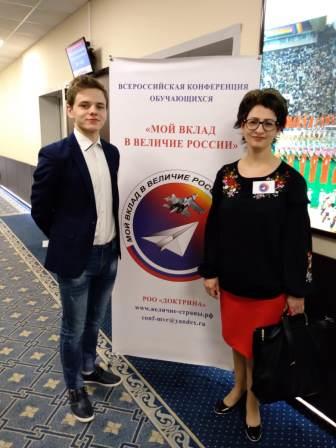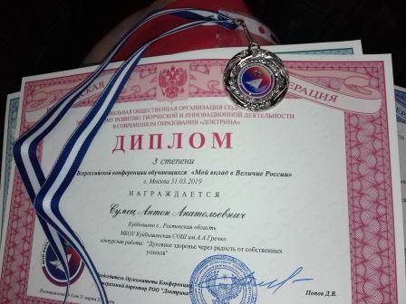 В г.Москва состоялась Всероссийская конференция обучающихся «МОЙ ВКЛАД В ВЕЛИЧИЕ РОССИИ». Обучающийся нашей школы, Сумец Антон, став победителем Всероссийского заочного конкурса обучающихся «МОЙ ВКЛАД В ВЕЛИЧИЕ РОССИИ», получил приглашение-вызов на Всероссийскую конференцию. Антон представил защиту своей творческой работы и был награжден ДИПЛОМОМ 3 степени Всероссийской конференции «МОЙ ВКЛАД В ВЕЛИЧИЕ РОССИИ».