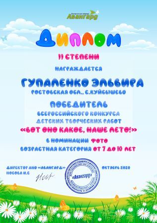 С 25 сентября по 25 октября проходил Всероссийский конкурс детских творческих работ «Вот оно какое, наше лето!». Победителем в номинации фото стала Гупаленко Эльвира, обучающаяся 1 «Б» класса, классный руководитель Н.А.Козлова.
