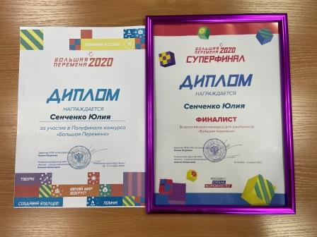 В МДЦ «Артек» завершился финал Всероссийского конкурса для школьников «Большая перемена» – проекта президентской платформы «Россия – страна возможностей». Юлия Сенченко, обучающаяся 11А класса, стала финалисткой конкурса.