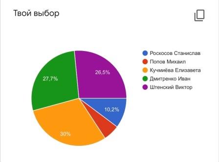 Большинством голосов (30 %) Президентом ЦУС «МЫ» избрана Кучмиёва Елизавета. Далее голоса распределились так: Дмитренко Иван – 27,7% , Штенский Виктор – 26,5%, Роскосов Станислав – 10,2%, Попов Михаил – 5,6%.