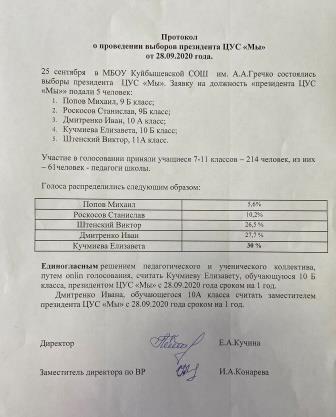В торжественной обстановке директор школы, Елена Анатольевна Кучина, поблагодарила всех кандидатов за активное участие в жизни школы, ответственность, целеустремленность в достижении поставленных целей и вручила удостоверение Президента Центра ученического самоуправления «Мы», уже действующему президенту с 28.09.2020 года, Кучмиёвой Елизавете.
