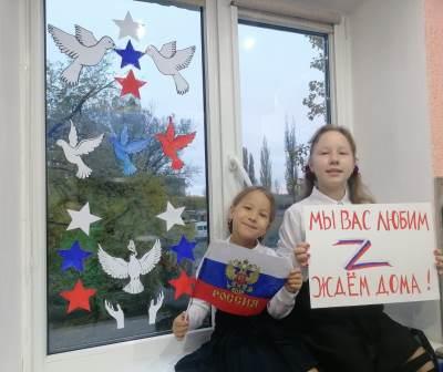 Организовали акцию «Окна России. Мы вас любим и ждем» ребята из основного отряда «ЮИДовская сила», резервного отряда 1«В» класса «Юная смена» МБОУ СОШ №8 поселка Шолоховский Белокалитвинского района Ростовской области и команды ЮПИД «Юный светофорик» МБДОУ ДС №40 «Золотой петушок». Слова поддержки участникам специальной военной операции приходят сейчас со всех концов России. Наши папы и братья выбрали настоящую мужскую профессию – защищать Родину. Будьте храбрыми, мужественными и достойными памяти ваших предков-победителей. Присоединяйтесь к нам и оформляйте свои окна рисунками, силуэтами белых голубей, бумажными шарами, звездами цветов российского флага, картинками, надписями, посвященными России и своей малой Родине.