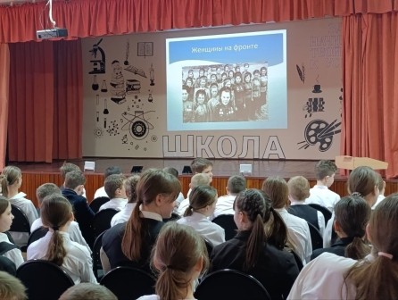 Для обучающихся 5-6 классов тема занятия — "Женщина на войне". Ребята узнали о судьбах уроженок Ростовской области, проявивших себя в годы Великой Отечественной войны. Среди них — сёстры Московые, которые в марте 1942 года вынесли с поля боя около 60 морских пехотинцев и красноармейцев, юная партизанка Е. Мирошникова, добывавшая ценные сведения для Южного фронта, и многие другие.