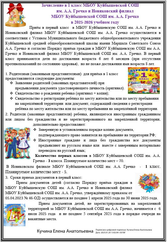 С 01.04.2025  года начинается приемная кампания по записи детей в 1 класс Муниципального бюджетного общеобразовательного учреждения Куйбышевской средней общеобразовательной школы имени Маршала Советского Союза А.А.Гречко и Новиковский филиал Муниципального бюджетного общеобразовательного учреждения Куйбышевской средней общеобразовательной школы имени Маршала Советского Союза А.А.Гречко.
