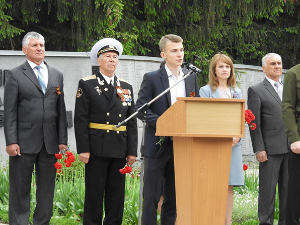 От имени обучающихся школы с обращением к участникам праздника выпускник В. Чмелев.