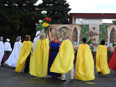 И вот, фанфары гласят о том, что праздник начинается! На школьном дворе появляются самые талантливые ученики 9-х классов, самые талантливые педагоги школы, во главе с директором Е.А. Кучиной и самые талантливые родители выпускников. Они поют и танцуют, приветствуя всех гостей. И вместе с этим создаётся некая интрига. Что же увидит зритель дальше? В центре площади появляются красная, белая и желтая розы – символ выпускного бала, который олицетворяет единство учителей, учеников и родителей.