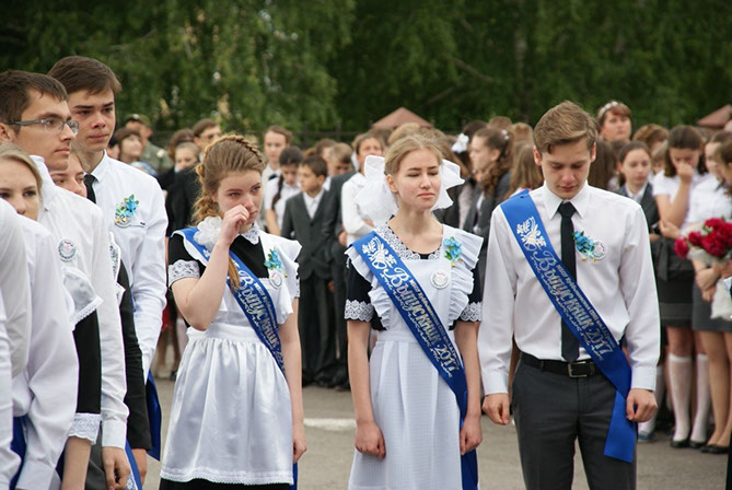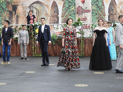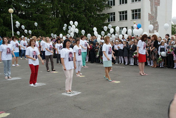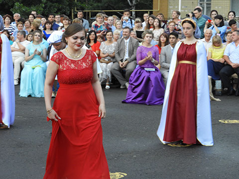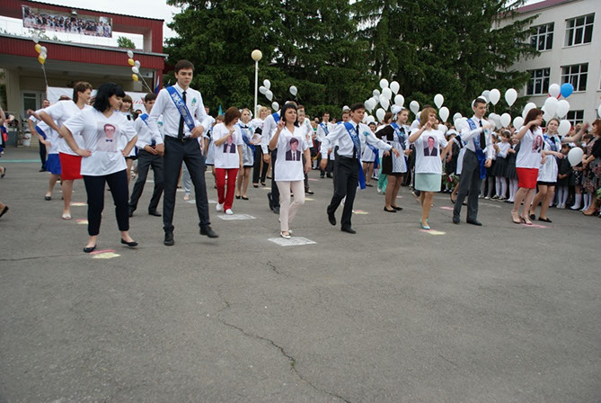 Появление выпускников на площади было не менее ярким. Две «равноуважаемых» семьи 11- а и 11-б классов, вместе со своими классными дамами Н. А. Перцевой и И.Н. Мирошниченко поразили гостей и зрителей праздника своим выходом. Это был импульсивный танец-