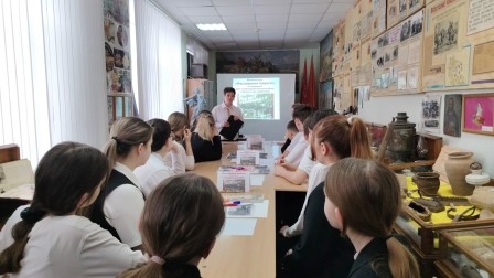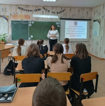 Для обучающихся 5-6 классов тема занятия — "Женщина на войне". Ребята узнали о судьбах уроженок Ростовской области, проявивших себя в годы Великой Отечественной войны. Среди них — сёстры Московые, которые в марте 1942 года вынесли с поля боя около 60 морских пехотинцев и красноармейцев, юная партизанка Е. Мирошникова, добывавшая ценные сведения для Южного фронта, и многие другие.